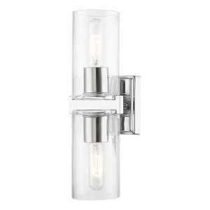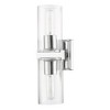 Collection: Clarion, Material: Steel, Finish Color: Polished Chrome, Width: 5", Height: 15", Depth: 5.25", Height From Outlet Box: 7.5", Backplate Width: 4.75", Backplate Length: 1", Lamping Type: Incandescent, Number Of Bulbs: 2, Wattage: 60 Watts, Moisture Rating: Dry Rated, Desc: The clarion transitional two light vanity sconce will bring posh sophistication to your decor. The backplate and clear cylinder glass give this polished chrome finish a sleek, contemporary look.,