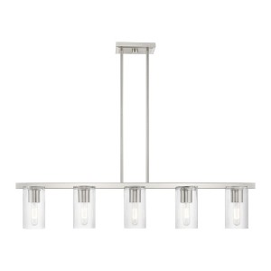 Collection: Clarion, Material: Steel, Finish Color: Brushed Nickel, Width: 4.5", Height: 14.75", Length: 42", Hanging Method: Stem, Lamping Type: Incandescent, Number Of Bulbs: 5, Wattage: 300 Watts, Moisture Rating: Dry Rated, Desc: The Clarion transitional five light linear chandelier will bring posh sophistication to your decor. The angular frame and clear cylinder glass give this satin brass finish a sleek, contemporary look.,
