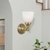 Collection: Classic, Material: Steel, Finish Color: Antique Brass, Width: 6", Height: 10", Depth: 6.5", Height From Outlet Box: 7.5", Backplate Width: 4.75", Backplate Length: 4.7", Lamping Type: Incandescent, Number Of Bulbs: 1, Wattage: 100 Watts, Moisture Rating: Dry Rated, Desc: In a polished brass finish, this one light bath fixture features a timeless torchiere design. Topped with Satin Opal White glass shades which provide a clean and classic look that will complete any space. This fixture is the perfect finishing touch when arranged alone or in pairs. Mounting Direction: Up/Down / Shade Included: Yes. ,