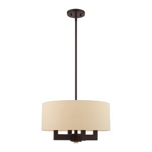Collection: Cresthaven, Material: Steel, Finish Color: Bronze/Antique Brass, Width: 18", Height: 18.5", Hanging Method: Stem, Lamping Type: Incandescent, Number Of Bulbs: 4, Wattage: 240 Watts, Moisture Rating: Dry Rated, Desc: The Cresthaven collection has a clean, crisp look and contemporary appeal. The hand-crafted ash gray linen fabric hardback shade offers a diffused warm light. This bronze finish with antique brass finish accents four-light pendant chandelier has sleek exposed angular arms making it tasteful to elevate your style. Will adapt well in the living room, dining room and bedroom. No. of Rods: 3 / Canopy Included: Yes / Shade Included: Yes / Canopy Diameter: 5.13 x 0.75 / Rod Length(s): 18.00. ,