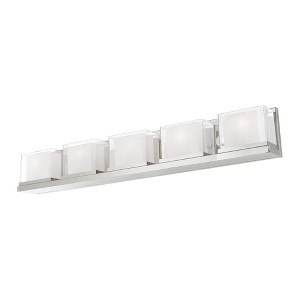 Collection: Duval, Material: Steel, Finish Color: Polished Chrome, Width: 42", Height: 6.75", Depth: 4.75", Height From Outlet Box: 3.38", Backplate Width: 42", Backplate Length: 6.75", Lamping Type: Incandescent, Number Of Bulbs: 5, Wattage: 60 Watts, Moisture Rating: Dry Rated, Desc: The Duval collection offers a fashionable fixture crafted from in a chrome finish. A quintet of compressed shades crafted from etched opal glass inside with a clear glass outside brings offers an art deco touch. Mounting Direction: Up/Down / Shade Included: Yes. ,