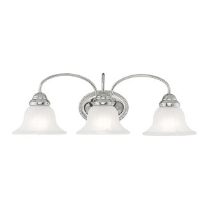 Collection: Edgemont, Material: Steel, Finish Color: Polished Chrome, Width: 23.5", Height: 8", Depth: 8.75", Height From Outlet Box: 4.25", Backplate Width: 7", Backplate Length: 5", Lamping Type: Incandescent, Number Of Bulbs: 3, Wattage: 100 Watts, Moisture Rating: Dry Rated, Desc: This three light bath vanity from the Edgemont collection is a fine and handsome fixture that features white alabaster glass. Edgemont is comprised of traditional iron forms in an polished brass finish. Mounting Direction: Up/Down / Shade Included: Yes. ,