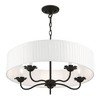 Collection: Edinburgh, Material: Steel, Finish Color: Black, Width: 23", Height: 14", Hanging Method: Chain, Chain Length: 36", Lamping Type: Incandescent, Number Of Bulbs: 5, Wattage: 300 Watts, Moisture Rating: Dry Rated, Desc: The five-light Edinburgh pendant chandelier combines floral details and elements to create an updated look. The hand-crafted off-white fabric hardback pleated drum shade is set off by an inner silky white fabric that combines with chandelier-like antique brass finish sweeping arms which creates a versatile effect. Perfect fit for the living room, dining room, kitchen or bedroom. Canopy Included: Yes / Canopy Diameter: 5.13 / Chain Length: 36.00 / Shade Included: Yes / Shade Dimensions: 23 x 5.5. ,