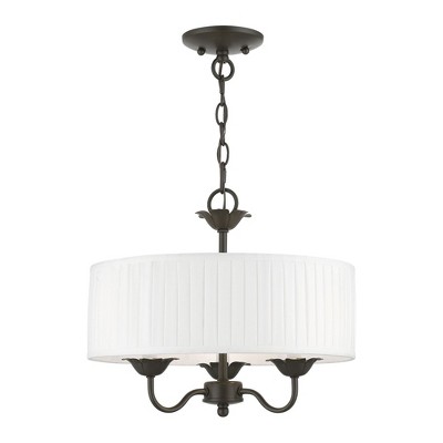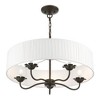 Collection: Edinburgh, Material: Steel, Finish Color: English Bronze, Width: 23", Height: 14", Hanging Method: Chain, Chain Length: 36", Lamping Type: Incandescent, Number Of Bulbs: 5, Wattage: 300 Watts, Moisture Rating: Dry Rated, Desc: The five-light Edinburgh pendant chandelier combines floral details and elements to create an updated look. The hand-crafted off-white fabric hardback pleated drum shade is set off by an inner silky white fabric that combines with chandelier-like antique brass finish sweeping arms which creates a versatile effect. Perfect fit for the living room, dining room, kitchen or bedroom. Canopy Included: Yes / Canopy Diameter: 5.13 / Chain Length: 36.00 / Shade Included: Yes / Shade Dimensions: 23 x 5.5. ,