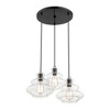 Collection: Everett, Material: Steel, Finish Color: Shiny Black/Chrome, Width: 20", Height: 15", Hanging Method: Cord, Lamping Type: Incandescent, Number Of Bulbs: 3, Wattage: 180 Watts, Moisture Rating: Dry Rated, Desc: The Everett three light pendant chandelier suspends simply and will adapt well over a kitchen countertop, in the living room, foyer or a dining room. It is shown in a shiny black finish with chrome finish accents and hand blown clear art glass.,