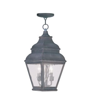 Collection: Exeter, Material: Brass, Finish Color: Bronze, Width: 8", Height: 19", Length: 8", Chain Length: 36", Lamping Type: Incandescent, Number Of Bulbs: 2, Wattage: 60 Watts, Moisture Rating: Damp Rated, Desc: Finished in charcoal with clear water glass, this outdoor hanging lantern offers plenty of stylish illumination for your home's exterior. Canopy Included: Yes / Shade Included: Yes / Canopy Diameter: 5.00. ,