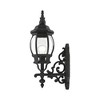 Collection: Frontenac, Material: Aluminum, Finish Color: Textured Black, Width: 7", Height: 21", Depth: 11", Height From Outlet Box: 13.25", Backplate Width: 4.5", Backplate Length: 11.75", Lamping Type: Incandescent, Number Of Bulbs: 1, Wattage: 100 Watts, Moisture Rating: Wet Rated, Desc: This classically transitional, cast aluminum outdoor wall lantern light is a six-sided lantern in white finish with clear beveled glass and a extravagantly decorative scrolls. Shade Included: Yes. ,