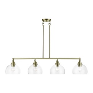 Collection: Glendon, Material: Steel, Finish Color: Antique Brass, Width: 8.25", Height: 18.75", Length: 45", Hanging Method: Stem, Lamping Type: Incandescent, Number Of Bulbs: 4, Wattage: 240 Watts, Moisture Rating: Dry Rated, Desc: This four light linear chandelier from the Glendon collection has understated elegance. It features minimal details, clear curved glass with an antique brass finish and can fit into any decor.,