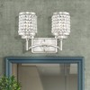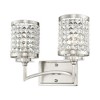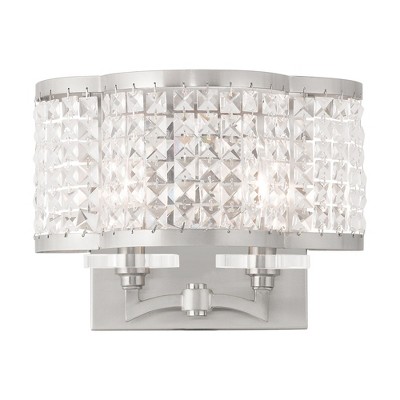 Collection: Grammercy, Material: Steel, Finish Color: Brushed Nickel, Width: 14.25", Height: 11.25", Depth: 6.5", Height From Outlet Box: 8.75", Backplate Width: 7.5", Backplate Length: 4.5", Lamping Type: Incandescent, Number Of Bulbs: 2, Wattage: 60 Watts, Moisture Rating: Dry Rated, Desc: Crystal strands strung in a decorative shade design define this classically glamorous bath fixture in which the bulbs are completely shaded, allowing the light to shine through the K9 crystal for a warm, intimate lighting feel. Shade Included: Yes. ,
