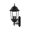 Collection: Hamilton, Material: Aluminum, Finish Color: Textured Black, Width: 12.5", Height: 28.75", Depth: 13.5", Height From Outlet Box: 19.5", Backplate Width: 4.5", Backplate Length: 13.5", Lamping Type: Incandescent, Number Of Bulbs: 3, Wattage: 60 Watts, Moisture Rating: Dry Rated, Desc: The elegant silhouette of the Hamilton collection is a classic that is sure to please even the most discrimiting taste. This outdoor three-light upward facing large wall lantern features a decorative top and arm which are paired with a simple six-sided frame in this textured black finish with clear beveled glass. Constructed of cast aluminum, this durable exterior fixture looks best in traditiol or transitiol outdoor settings. Shade Included: Yes. ,