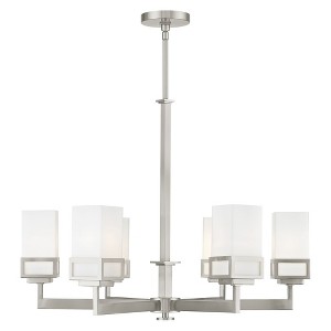 Collection: Harding, Material: Steel, Finish Color: Brushed Nickel, Width: 28.5", Height: 29.5", Hanging Method: Stem, Lamping Type: Incandescent, Number Of Bulbs: 6, Wattage: 600 Watts, Moisture Rating: Dry Rated, Desc: The transitional style of the Harding six light chandelier features an eye-catching satin opal white glass shade floating inside a unique double forged square design in a brushed nickel finish. No. of Rods: 3 / Canopy Included: Yes / Shade Included: Yes / Canopy Diameter: 4.75 / Rod Length(s): 18.00. ,
