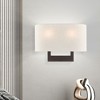 Collection: Hayworth, Material: Steel, Finish Color: Bronze, Width: 14", Height: 9.5", Depth: 3.95", Height From Outlet Box: 3.5", Backplate Width: 10.63", Backplate Length: 6", Lamping Type: Incandescent, Number Of Bulbs: 2, Wattage: 40 Watts, Moisture Rating: Dry Rated, Desc: Raise the style bar with a designer wall sconce in a handsome and versatile contemporary manner. This two light wall sconce comes in a brushed nickel finish with a rectangular off-white fabric hardback shade.,