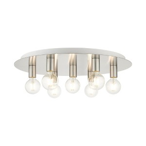 Collection: Hillview, Material: Steel, Finish Color: Brushed Nickel, Width: 24", Height: 3.63", Hanging Method: Flush, Lamping Type: Incandescent, Number Of Bulbs: 7, Wattage: 40 Watts, Moisture Rating: Dry Rated, Desc: Minimal and versatile describes the Hillview collection. Two-tone finishes grace this group creating a stylish and sophisticated appearance. This seven-light flush mount ceiling fixture will look great in a traditiol, transitiol, modern or contemporary bedroom, hallway, bathroom and kitchen. It is shown in a bronze finish with satin brass finish accents. Canopy Included: Yes / Canopy Diameter: 21.5 x 1.25. ,