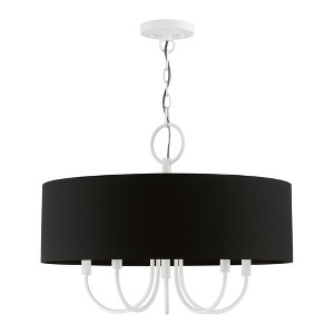 Collection: Huntington, Material: Steel, Finish Color: White, Width: 23", Height: 17.5", Hanging Method: Chain, Chain Length: 36", Lamping Type: Incandescent, Number Of Bulbs: 5, Wattage: 300 Watts, Moisture Rating: Dry Rated, Desc: The five-light Huntington pendant chandelier is both modern and versatile. The hand-crafted black fabric hardback drum shade combines with chandelier-like antique brass finish sweeping arms which creates a versatile effect. Perfect fit for the living room, dining room, kitchen and bedroom. Canopy Included: Yes / Canopy Diameter: 5.13 / Chain Length: 36.00 / Shade Included: Yes / Shade Dimensions: 23 x 7. ,