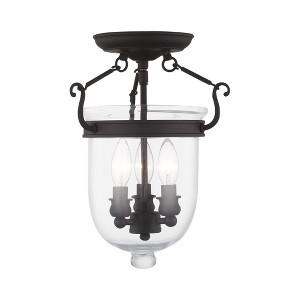 Collection: Jefferson, Material: Steel, Finish Color: Black, Width: 10", Height: 14", Lamping Type: Incandescent, Number Of Bulbs: 3, Wattage: 60 Watts, Moisture Rating: Damp Rated, Desc: Carrying the vision of rich opulence, the Jefferson has evolved through times remaining a focal point of richness and affluence. From visions of old time class to modern day elegance, the bell jar remains a favorite in several settings of the home. Using hand blown clear glass...the possibilities are endless to find a piece that matches your desired personality and vision. Canopy Included: Yes / Shade Included: Yes / Canopy Diameter: 6.00. Canopy Diameter: 6. ,