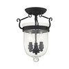 Collection: Jefferson, Material: Steel, Finish Color: Black, Width: 10", Height: 14", Lamping Type: Incandescent, Number Of Bulbs: 3, Wattage: 60 Watts, Moisture Rating: Dry Rated, Desc: Carrying the vision of rich opulence, the Jefferson has evolved through times remaining a focal point of richness and affluence. From visions of old time class to modern day elegance, the bell jar remains a favorite in several settings of the home. Using hand blown clear seeded glass...the possibilities are endless to find a piece that matches your desired personality and vision. Canopy Included: Yes / Shade Included: Yes / Canopy Diameter: 6.00. ,