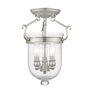 Collection: Jefferson, Material: Steel, Finish Color: Brushed Nickel, Width: 10", Height: 14", Lamping Type: Incandescent, Number Of Bulbs: 3, Wattage: 60 Watts, Moisture Rating: Dry Rated, Desc: Carrying the vision of rich opulence, the Jefferson has evolved through times remaining a focal point of richness and affluence. From visions of old time class to modern day elegance, the bell jar remains a favorite in several settings of the home. Using hand blown clear seeded glass...the possibilities are endless to find a piece that matches your desired personality and vision. Canopy Included: Yes / Shade Included: Yes / Canopy Diameter: 6.00. ,