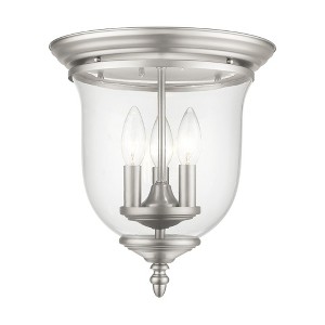 Collection: Legacy, Material: Steel, Finish Color: Brushed Nickel, Width: 11.5", Height: 12.5", Hanging Method: Flush, Lamping Type: Incandescent, Number Of Bulbs: 3, Wattage: 60 Watts, Moisture Rating: Dry Rated, Desc: The Legacy collection offers a chic update to traditional style lighting. This flush mount light design comes in a beautiful polished nickel finish with a traditional glass bell jar adding style. Shade Included: Yes. ,