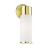 Collection: Lindale, Material: Steel, Finish Color: Satin Brass, Width: 4.25", Height: 11.25", Depth: 3.9", Height From Outlet Box: 9", Backplate Width: 4.25", Backplate Length: 0.5", Lamping Type: Incandescent, Number Of Bulbs: 1, Wattage: 60 Watts, Moisture Rating: Dry Rated, Desc: Add a dash of character and radiance to your home with this wall sconce. This single-light fixture from the Lindale Collection features a satin brass finish with a satin opal white glass. The clean lines of the back plate complement the cylindrical glass shade adorned with detailed trim on top creating a minimal, sleek, urban look that works well in most decors. This fixture adds upscale charm and contemporary aesthetics to your home.,