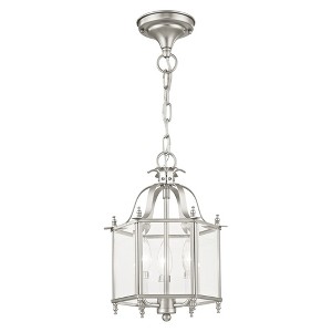 Collection: Livingston, Material: Steel, Finish Color: Brushed Nickel, Width: 10", Height: 15.25", Hanging Method: Chain, Chain Length: 24", Lamping Type: Incandescent, Number Of Bulbs: 3, Wattage: 180 Watts, Moisture Rating: Dry Rated, Desc: The Livingston collection features a classic six-sided lantern silhouette. Polished brass finish with clear beveled glass gives the fixture charming style and the candelabra bulbs will fill your home with generous amounts of illumination that welcomes your guests. The versatile fixture can be transformed into semi-flush ceiling mounts.,