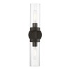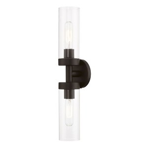 Collection: Ludlow, Material: Steel, Finish Color: Bronze, Width: 4.25", Height: 19.25", Depth: 4", Height From Outlet Box: 9.63", Backplate Width: 4.25", Backplate Length: 0.63", Lamping Type: Incandescent, Number Of Bulbs: 2, Wattage: 60 Watts, Moisture Rating: Dry Rated, Desc: Add a dash of character and radiance to your home with this wall sconce. This two-light fixture from the Ludlow Collection features an antique brass finish with a clear glass. The clean lines of the back plate complement the cylindrical glass shades creating a minimal, sleek, urban look that works well in most decors. This fixture adds upscale charm and contemporary aesthetics to your home.,