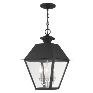 Collection: Mansfield, Material: Brass, Finish Color: Black, Width: 12", Height: 19", Length: 12", Chain Length: 36", Lamping Type: Incandescent, Number Of Bulbs: 3, Wattage: 60 Watts, Moisture Rating: Dry Rated, Desc: With its appealing black finish and clear glass, the stunning Mansfield collection will make an elegant addition to any outdoor space. Formed from solid brass & traditiolly inspired, this three-light outdoor large pendant is perfect for your entry way. Combining superb craftsmanship and affordable price, this fixture is sure to be a timeless addition to your home. Canopy Included: Yes / Shade Included: Yes / Canopy Diameter: 5 x 0.75. ,