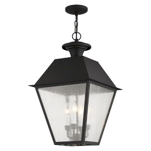 Collection: Mansfield, Material: Brass, Finish Color: Black, Width: 15", Height: 24.5", Length: 15", Chain Length: 36", Lamping Type: Incandescent, Number Of Bulbs: 4, Wattage: 60 Watts, Moisture Rating: Dry Rated, Desc: With stunning seeded glass and a charcoal finish, this outdoor hanging lantern will make an elegant addition to any outdoor space. Formed from solid brass & traditionally-inspired, this hanging outdoor lantern is perfect for a back porch or entry way. Canopy Included: Yes / Shade Included: Yes / Canopy Diameter: 5.00. ,