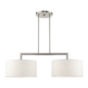 Collection: Meridian, Material: Steel, Finish Color: Brushed Nickel, Width: 14", Height: 18", Length: 35", Hanging Method: Stem, Lamping Type: Incandescent, Number Of Bulbs: 2, Wattage: 120 Watts, Moisture Rating: Dry Rated, Desc: The Meridian collection has a clean, crisp look and contemporary appeal. The hand-crafted off-white fabric hardback shades offer a diffused warm light. This two-light linear chandelier has a sleek upper frame over the shades. Will adapt well in the living room, dining room and over the kitchen island tastefully elevating your style. This sleek design is shown in a black chrome finish. No. of Rods: 6 / Canopy Included: Yes / Shade Included: Yes / Canopy Diameter: 8 x 0.75 / Rod Length(s): 18.00. ,