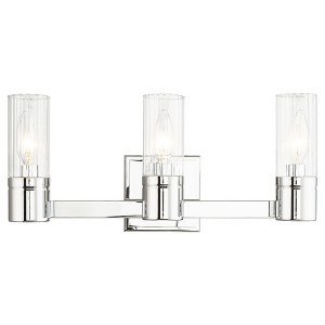 Collection: Midtown, Material: Steel, Finish Color: Polished Chrome, Width: 17.5", Height: 7.75", Depth: 4", Height From Outlet Box: 5.5", Backplate Width: 4.5", Backplate Length: 4.5", Lamping Type: Incandescent, Number Of Bulbs: 3, Wattage: 60 Watts, Moisture Rating: Dry Rated, Desc: The Midtown three light bath fixture in polished chrome finish with clear ribbed glass shade offers a mix of the classic and the modern. Perfect for a contemporary home or a traditional entryway, this transitional fixture is as versatile as it is appealing. Mounting Direction: Up/Down / Shade Included: Yes. ,