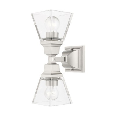 Collection: Mission, Material: Steel, Finish Color: Brushed Nickel, Width: 15", Height: 9.5", Depth: 7.75", Height From Outlet Box: 7.25", Backplate Width: 4.5", Backplate Length: 2.88", Lamping Type: Incandescent, Number Of Bulbs: 2, Wattage: 100 Watts, Moisture Rating: Dry Rated, Desc: The Mission collection has clean lines with geometric forms. This two light bath vanity light features clear glass on polished brass, square style arms that elevates the classic look. Mounting Direction: Up/Down / Shade Included: Yes. ,
