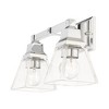Collection: Mission, Material: Steel, Finish Color: Polished Chrome, Width: 15", Height: 9.5", Depth: 7.75", Height From Outlet Box: 7.25", Backplate Width: 4.5", Backplate Length: 2.88", Lamping Type: Incandescent, Number Of Bulbs: 2, Wattage: 100 Watts, Moisture Rating: Dry Rated, Desc: The Mission collection has clean lines with geometric forms. This two light bath vanity light features clear glass on polished brass, square style arms that elevates the classic look. Mounting Direction: Up/Down / Shade Included: Yes. ,