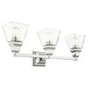 Collection: Mission, Material: Steel, Finish Color: Polished Chrome, Width: 25.25", Height: 9.5", Depth: 7.75", Height From Outlet Box: 7.25", Backplate Width: 4.5", Backplate Length: 2.88", Lamping Type: Incandescent, Number Of Bulbs: 3, Wattage: 100 Watts, Moisture Rating: Dry Rated, Desc: The Mission collection has clean lines with geometric forms. This three light bath vanity light features clear glass on polished brass square style arms that elevates the classic look. Mounting Direction: Up/Down / Shade Included: Yes. ,