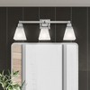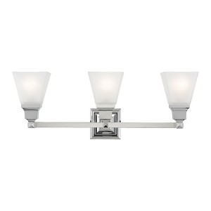 Collection: Mission, Material: Steel, Finish Color: Polished Chrome, Width: 25.25", Height: 9.5", Depth: 7.75", Height From Outlet Box: 7.5", Backplate Width: 4.5", Lamping Type: Incandescent, Number Of Bulbs: 3, Wattage: 100 Watts, Moisture Rating: Dry Rated, Desc: The Mission collection has clean lines with geometric forms. This three light bath fixture with etched opal glass is finished in polished chrome. Square bar style arms elevate the glass. Mounting Direction: Up/Down / Shade Included: Yes. ,