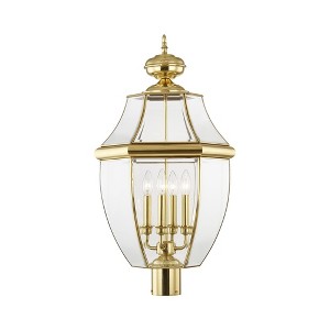 Collection: Monterey, Material: Brass, Finish Color: Polished Brass, Width: 16", Height: 29", Lamping Type: Incandescent, Number Of Bulbs: 4, Wattage: 60 Watts, Moisture Rating: Dry Rated, Desc: The Monterey outdoor lighting features clean, crisp lines complemented by the graceful curves of beveled glass. Crafted from sturdy solid brass this handsome colonial styling makes this fixture a perfect addition to your outdoor spaces. Shade Included: Yes. ,