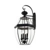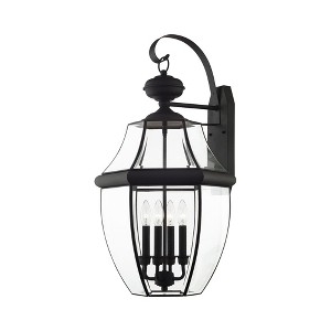 Collection: Monterey, Material: Brass, Finish Color: Black, Width: 16", Height: 30", Depth: 15", Height From Outlet Box: 12.5", Backplate Width: 5", Backplate Length: 12.5", Lamping Type: Incandescent, Number Of Bulbs: 4, Wattage: 60 Watts, Moisture Rating: Dry Rated, Desc: The Monterey outdoor lighting features clean, crisp lines complemented by the graceful curves of beveled glass. Crafted from sturdy solid brass this handsome colonial styling makes this fixture a perfect addition to your outdoor spaces.,
