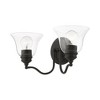 Collection: Moreland, Material: Steel, Finish Color: Black, Width: 15.25", Height: 7.5", Depth: 8", Height From Outlet Box: 4.5", Backplate Width: 5.38", Backplate Length: 1", Lamping Type: Incandescent, Number Of Bulbs: 2, Wattage: 60 Watts, Moisture Rating: Dry Rated, Desc: Bring a refined lighting style to your bath area with this Moreland collection two light vanity sconce. Shown in an antique brass finish and clear glass.,
