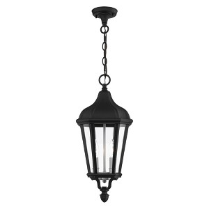 Collection: Morgan, Material: Aluminum, Finish Color: Textured Black, Width: 9", Height: 20.5", Chain Length: 36", Lamping Type: Incandescent, Number Of Bulbs: 2, Wattage: 60 Watts, Moisture Rating: Dry Rated, Desc: With clear glass and a classic bronze finish, this outdoor chain hung lantern from the Morgan collection is an elegant way to illuminate traditional exteriors. Canopy Included: Yes / Shade Included: Yes / Canopy Diameter: 4.25. ,