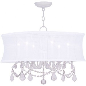Collection: Newcastle, Material: Steel, Finish Color: Brushed Nickel, Width: 16", Height: 17.75", Chain Length: 36", Lamping Type: Incandescent, Number Of Bulbs: 4, Wattage: 60 Watts, Moisture Rating: Damp Rated, Desc: Add glamour to your home with this enchanting shaded chandelier. Scrolling arms adorned in a white finish are paired with glittering crystal drops that reflect light when illuminated. A white handmade silk shimmer shade completes this chic design. Canopy Included: Yes / Shade Included: Yes / Canopy Diameter: 5.00. ,