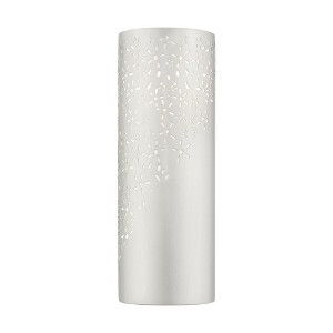 Collection: Noria, Material: Steel, Finish Color: Brushed Nickel, Width: 5", Height: 14", Depth: 3.9", Height From Outlet Box: 7", Backplate Width: 4.38", Backplate Length: 13.25", Lamping Type: Incandescent, Number Of Bulbs: 2, Wattage: 40 Watts, Moisture Rating: Dry Rated, Desc: The Noria collection combines an intricate organic laser cut black finish steel frame surrounds an off-white fabric shade creating a warm light with a touch of ture vibe. This small two-light sconce will have a definitive presence in many areas of your home. You can place it in the living room, hallway, bathroom or in the bedroom. Hang this piece vertically or horizontally.,