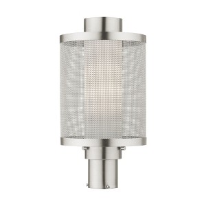 Collection: Nottingham, Material: Steel, Finish Color: Brushed Nickel, Width: 9", Height: 17.5", Lamping Type: Incandescent, Number Of Bulbs: 1, Wattage: 60 Watts, Moisture Rating: Dry Rated, Desc: The Nottingham outdoor collection has a clean, crisp look and contemporary appeal. This single light stainless steel large post top lantern has a textured black finish and features a sleek stainless steel mesh shade with satin opal white glass. Shade Included: Yes. ,