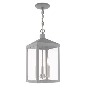 Collection: Nyack, Material: Steel, Finish Color: Nordic Gray, Width: 8.25", Height: 18.5", Chain Length: 36", Lamping Type: Incandescent, Number Of Bulbs: 3, Wattage: 60 Watts, Moisture Rating: Dry Rated, Desc: The dramatically simple shape and bold lines help define our Nyack wall lantern. Featured in a antique brass finish, this outdoor pendant lantern has panels of clear glass. Canopy Included: Yes / Shade Included: Yes / Canopy Diameter: 5 x 0.75. ,