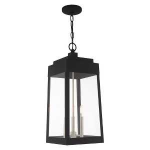 Collection: Oslo, Material: Brass, Finish Color: Black, Width: 10.5", Height: 24.5", Length: 10.5", Chain Length: 36", Lamping Type: Incandescent, Number Of Bulbs: 3, Wattage: 60 Watts, Moisture Rating: Dry Rated, Desc: This updated industrial design comes in a tapering solid brass black frame with a sleek, straight-lined look. Clear glass panels offer a full view of the brushed nickel accents, that will house the bulb of your choice. Canopy Included: Yes / Shade Included: Yes / Canopy Diameter: 5.00. ,