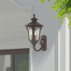 Collection: Oxford, Material: Aluminum, Finish Color: Imperial Bronze, Width: 11", Height: 22", Depth: 13.25", Height From Outlet Box: 16", Backplate Width: 5.25", Backplate Length: 10", Lamping Type: Incandescent, Number Of Bulbs: 3, Wattage: 60 Watts, Moisture Rating: Dry Rated, Desc: From the Oxford outdoor lantern collection, this traditional design will add curb appeal to any home. It features a handsome, antique-style wall plate and decorative arm. Light amber water glass cast an appealing light and lends to its vintage charm. Wall plate, arm and other details are all in a imperial bronze finish. Shade Included: Yes. ,