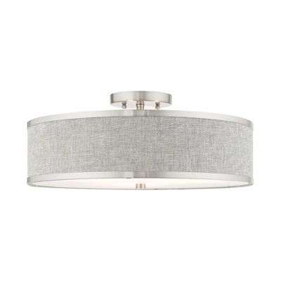 Collection: Park Ridge, Material: Steel, Finish Color: Brushed Nickel, Width: 15", Height: 8", Lamping Type: Incandescent, Number Of Bulbs: 3, Wattage: 60 Watts, Moisture Rating: Dry Rated, Desc: Update your decor with this sleek semi flush mount design. The shaded frame comes in a bronze finish which nicely complements the hand crafted off-white fabric hardback shade. Canopy Included: Yes / Shade Included: Yes / Canopy Diameter: 5.00. ,