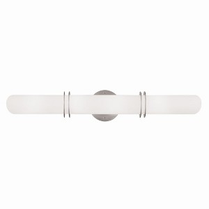 Collection: Pelham, Material: Steel, Finish Color: Brushed Nickel, Width: 26.5", Height: 4.5", Depth: 3.75", Height From Outlet Box: 2", Backplate Width: 4.5", Lamping Type: Incandescent, Number Of Bulbs: 4, Wattage: 60 Watts, Moisture Rating: Dry Rated, Desc: Create warm ambient lighting with this contemporary style bath fixture. It's soft brushed nickel finish creates sleek lines in the frame. It features a hand blown satin opal white glass, ideal for giving your room a soft light. This fixture can be mounted vertically or horizontally. Mounting Direction: Up/Down / Shade Included: Yes. ,