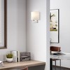 Collection: Petite, Material: Steel, Finish Color: Brushed Nickel, Width: 8", Height: 9.5", Depth: 3.95", Height From Outlet Box: 3.5", Backplate Width: 6", Backplate Length: 6", Lamping Type: Incandescent, Number Of Bulbs: 1, Wattage: 40 Watts, Moisture Rating: Dry Rated, Desc: Raise the style bar with a designer wall sconce in a handsome and versatile contemporary manner. This one light wall sconce comes in an antique brass finish with a rectangular oatmeal fabric hardback shade.,