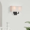 Collection: Pierson, Material: Steel, Finish Color: Bronze, Width: 16", Height: 12", Depth: 3.88", Height From Outlet Box: 8.5", Backplate Width: 4.38", Backplate Length: 6", Lamping Type: Incandescent, Number Of Bulbs: 2, Wattage: 40 Watts, Moisture Rating: Dry Rated, Desc: The contemporary design of the Pierson wall sconce is as beautiful as it is simple. An open rectangle, antique brass finish frame is paired with a light and airy horizontal rectangle off-white fabric hardback shade.,