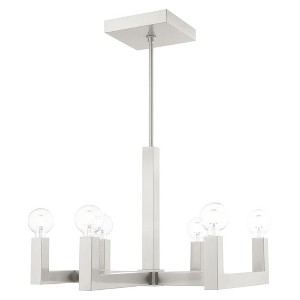 Collection: Solna, Material: Steel, Finish Color: Brushed Nickel, Width: 24.38", Height: 20", Length: 28.38", Hanging Method: Stem, Lamping Type: Incandescent, Number Of Bulbs: 6, Wattage: 360 Watts, Moisture Rating: Dry Rated, Desc: Less is more with this sleek minimalist styled Solna collection. With the polished chrome finish stainless steel square tubular arms, this six-light chandelier is the perfect fixture for adding modern pizzazz to your decor. No. of Rods: 4 / Canopy Included: Yes / Canopy Diameter: 8.5 x 1.5 / Rod Length(s): 18.00. ,
