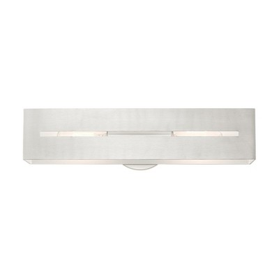 Collection: Soma, Material: Steel, Finish Color: Brushed Nickel, Width: 5", Height: 14", Depth: 3.38", Height From Outlet Box: 11.5", Backplate Width: 5", Backplate Length: 0.25", Lamping Type: Incandescent, Number Of Bulbs: 1, Wattage: 60 Watts, Moisture Rating: Dry Rated, Desc: Inspired by the modern skyscraper design, the architectural lines of the Soma collection are truly suitable for urban and contemporary environments such as an industrial loft. The exposed bulbs make a beautiful accompaniment to the distinctive contrasting finishes of this rectilinear piece. This contemporary two light vanity sconce comes in a polished chrome finish with a shiny white inside. It fits perfectly in a minimalistic modern bathroom, hallway or bedroom. Mounting Direction: Up or Down / Shade Included: Yes. ,