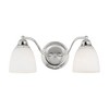 Collection: Somerville, Material: Steel, Finish Color: Polished Chrome, Width: 15.25", Height: 7", Depth: 7.5", Height From Outlet Box: 3.5", Backplate Width: 5.5", Backplate Length: 5.5", Lamping Type: Incandescent, Number Of Bulbs: 2, Wattage: 100 Watts, Moisture Rating: Dry Rated, Desc: The hand blown satin opal white shades extend from gently curved arms reaching from the round backplate and are finished with small, orb finials at both ends to reinforce the curvaceous motif.,